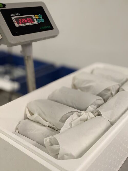 Our razor clams are packaged with the utmost care to ensure they arrive in the best shape possible. We pack them in 23kg boxes, containing 23 bundles of 1kg. To keep the razor clams cool and moist, we add ice packs to each box.